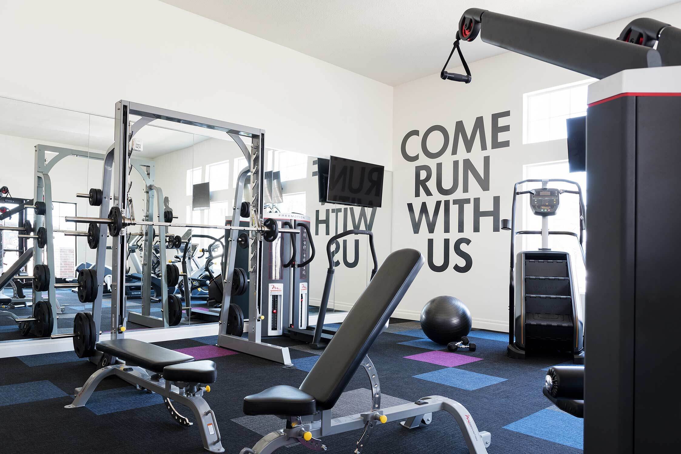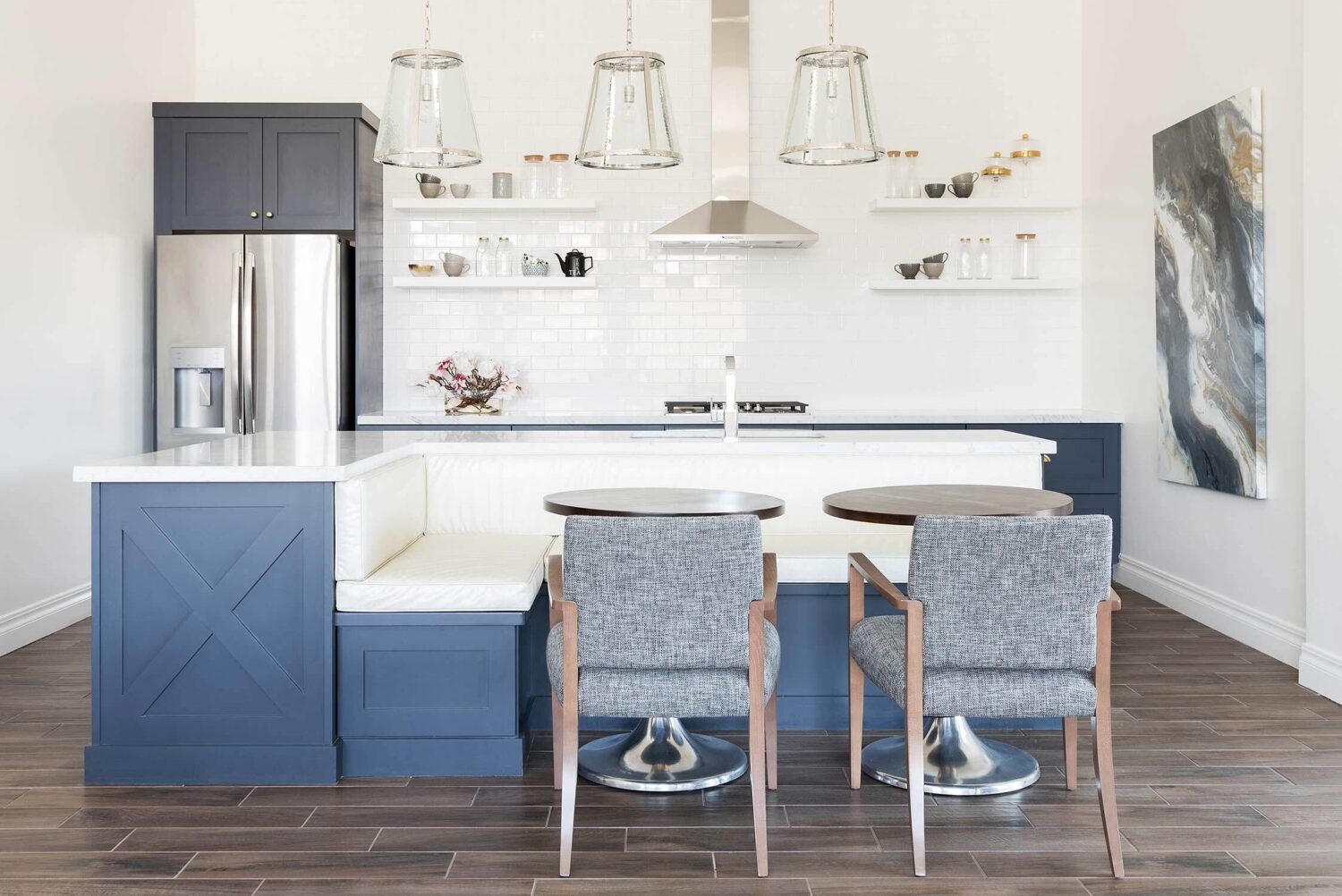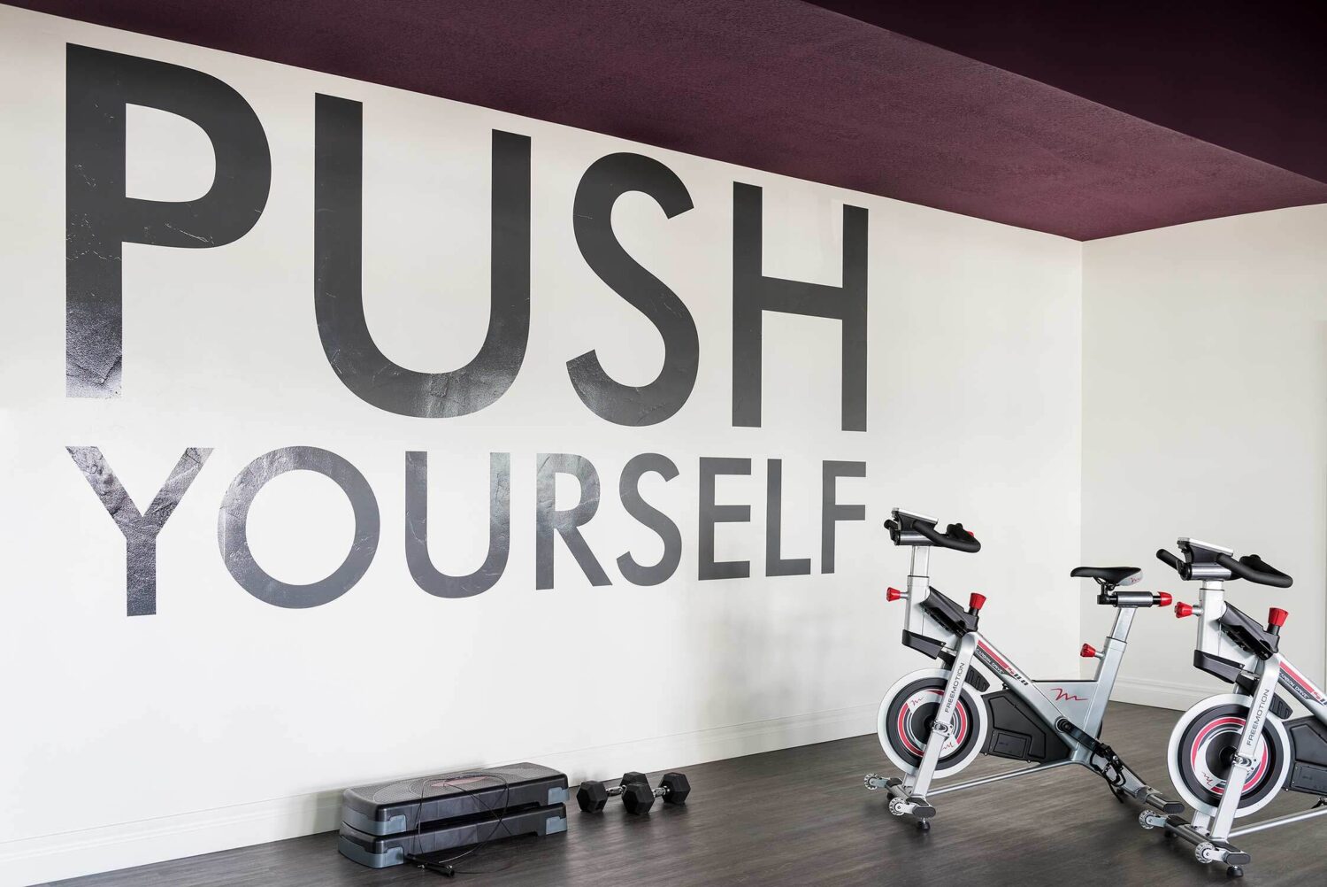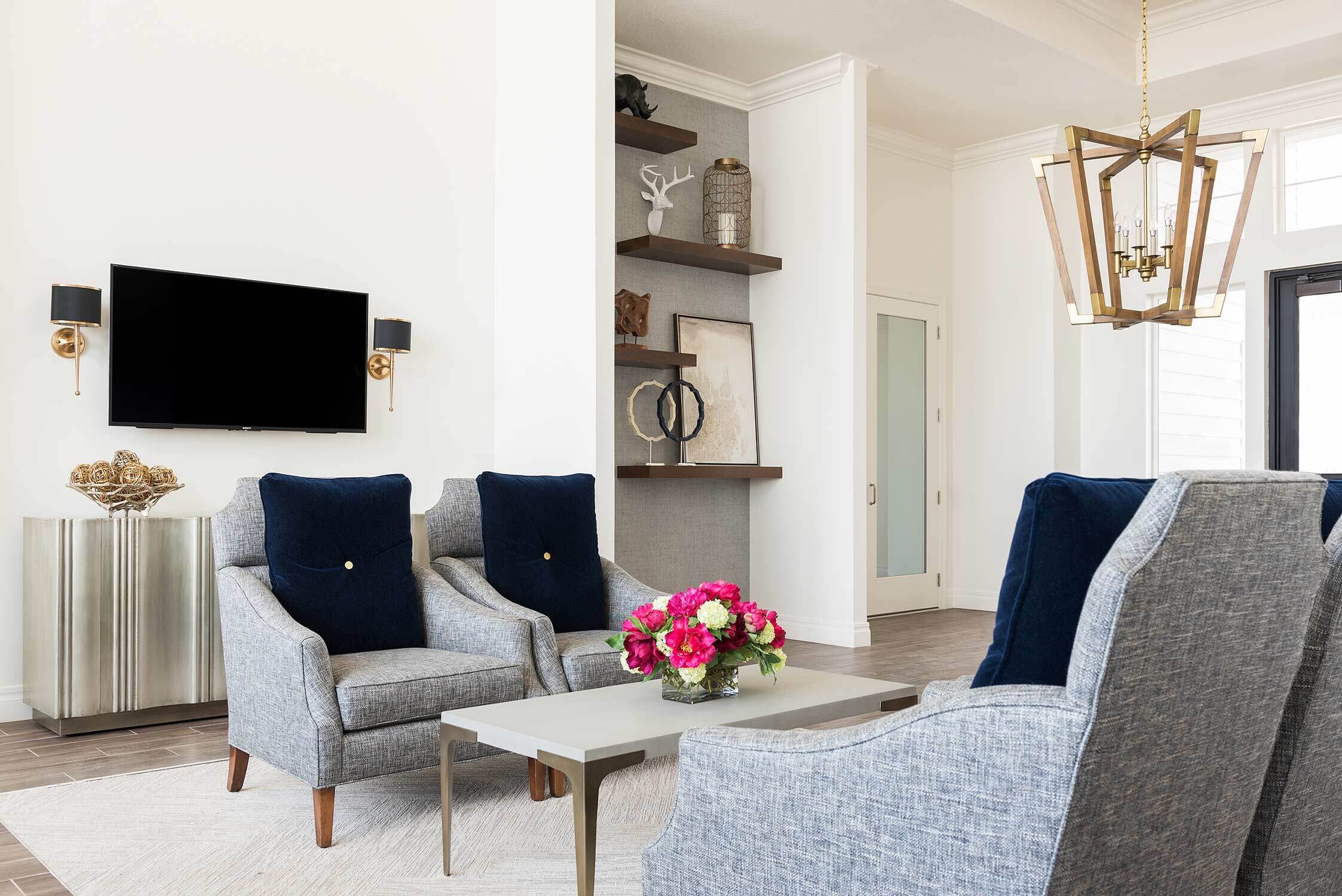 Rivulet Apartments is a resort-inspired community offering a relaxed yet luxurious environment with amenities galore. When our team was asked to design the complex’s primary public gathering space and gym, we knew we needed a few modern accents that would invite residents in. By creating a community kitchen and applying eye-catching graphic treatments to the gym walls, the design meets the modern needs and desires of its residents.