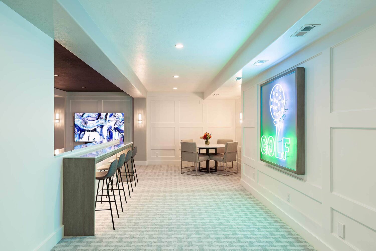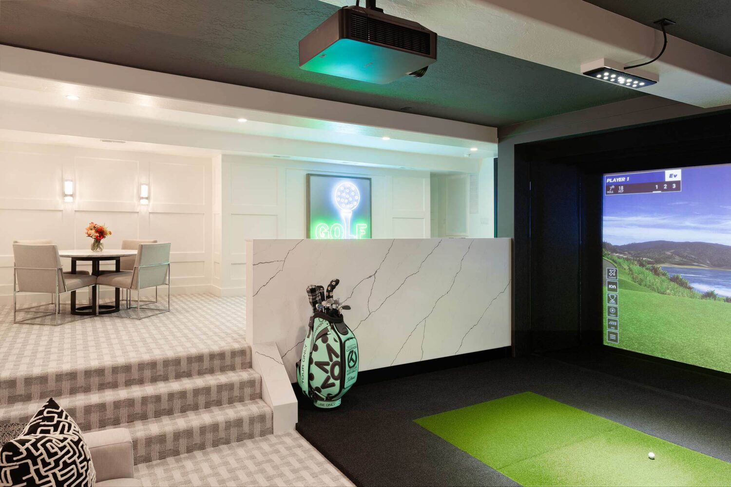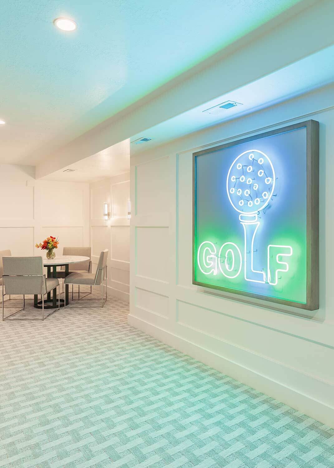 Looking to take your golf game to the next level? This basement allows its homeowners to practice their swing without leaving the house. Our residential team had fun reimagining this basement in an aesthetically pleasing way that's also functional. Lighting played a huge role in our design with a custom neon sign and uplighting that sets off bar seating.