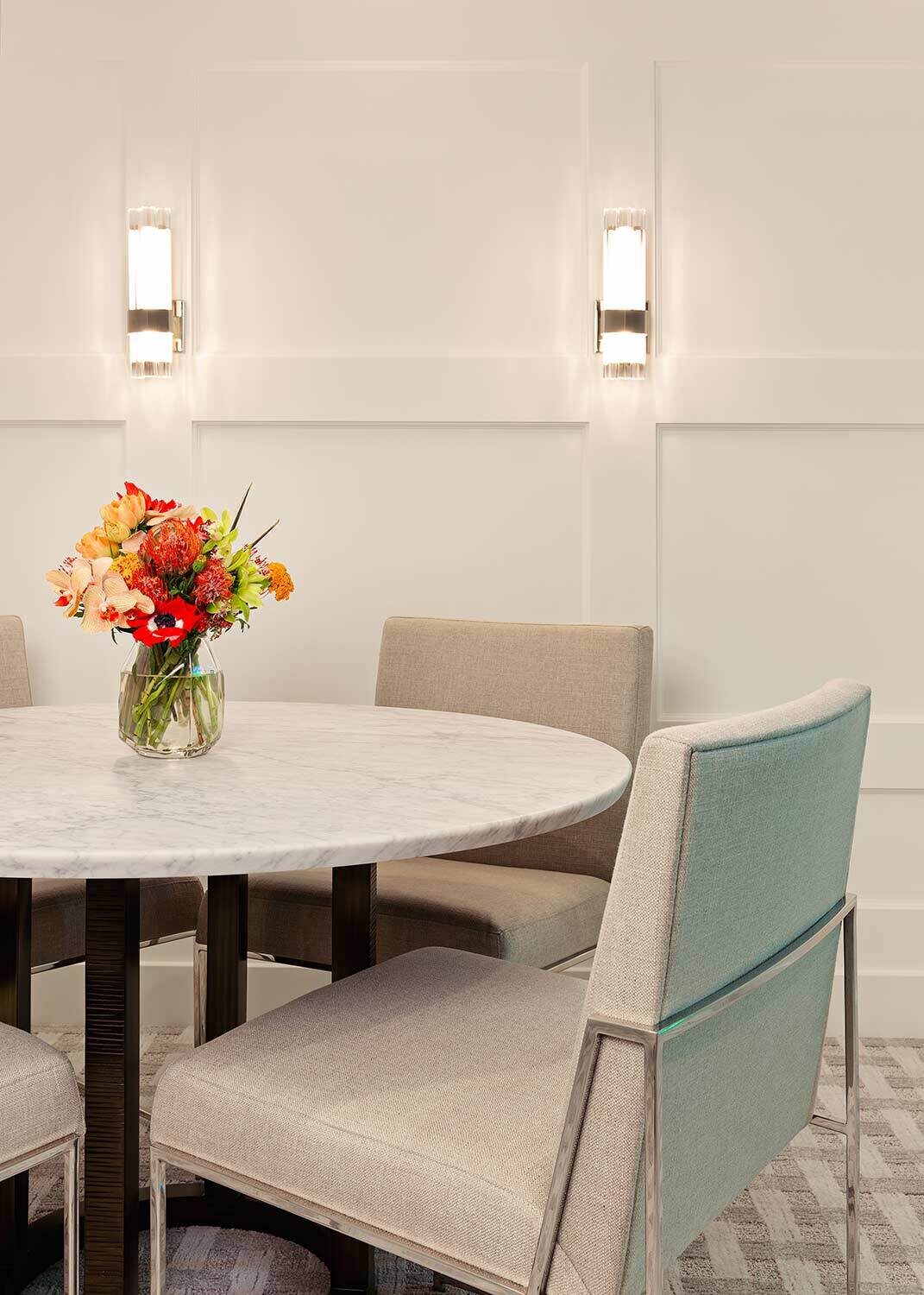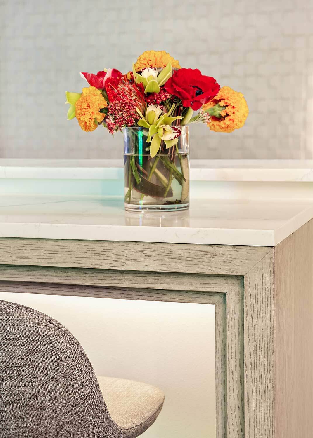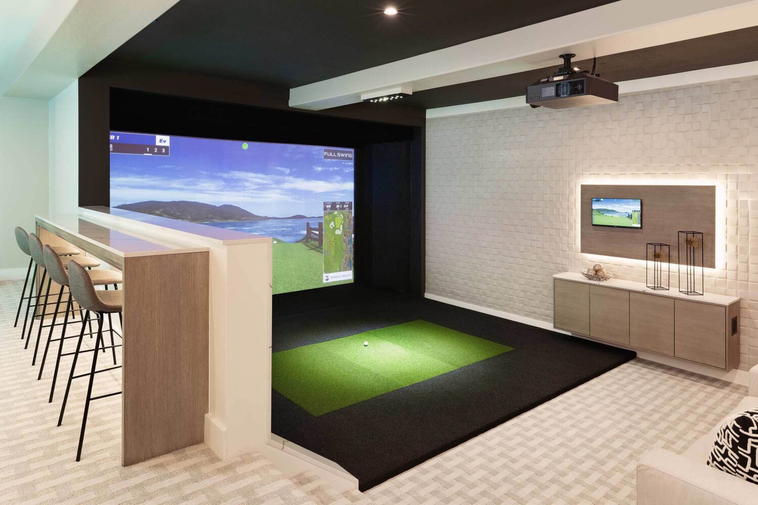 Looking to take your golf game to the next level? This basement allows its homeowners to practice their swing without leaving the house. Our residential team had fun reimagining this basement in an aesthetically pleasing way that's also functional. Lighting played a huge role in our design with a custom neon sign and uplighting that sets off bar seating.