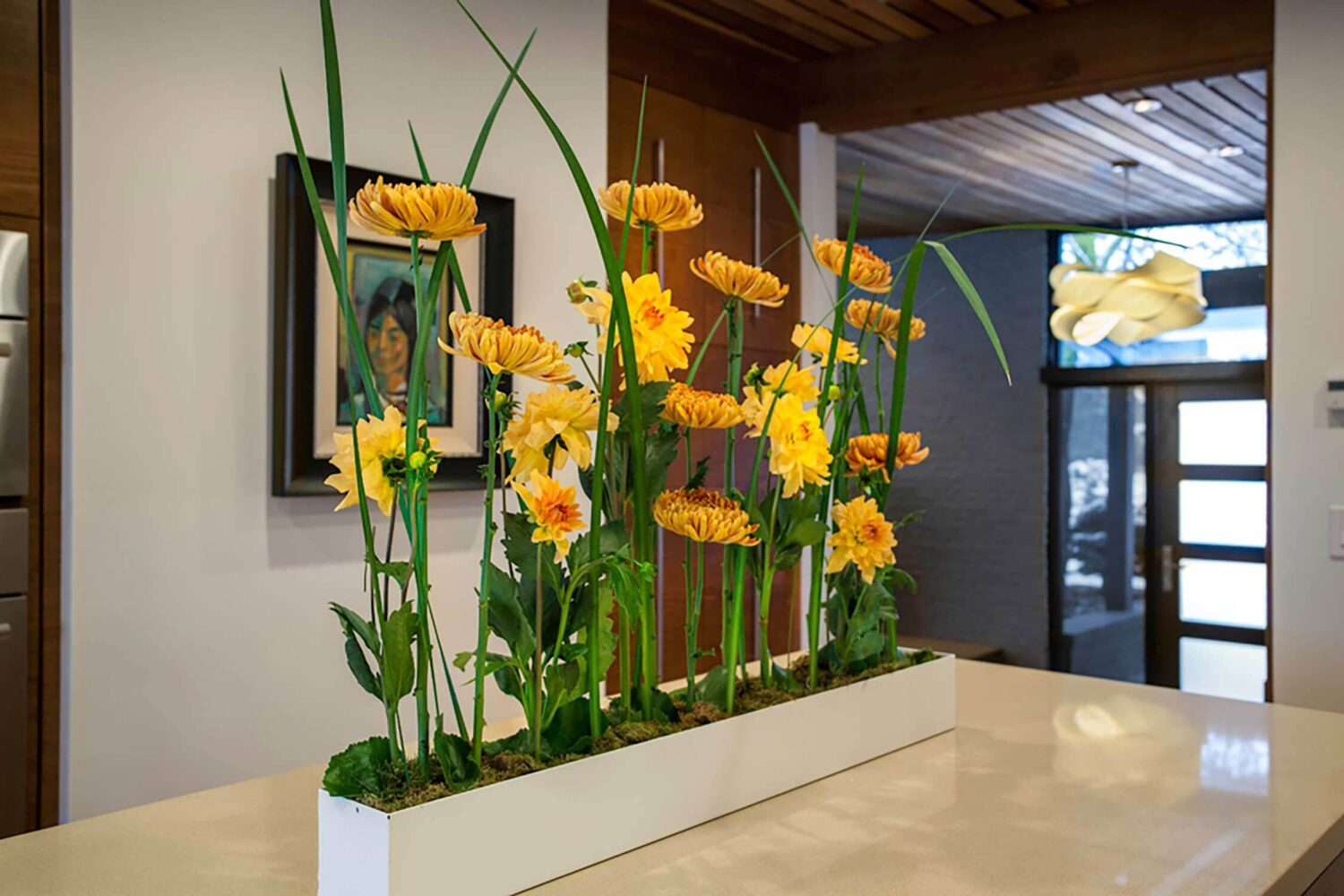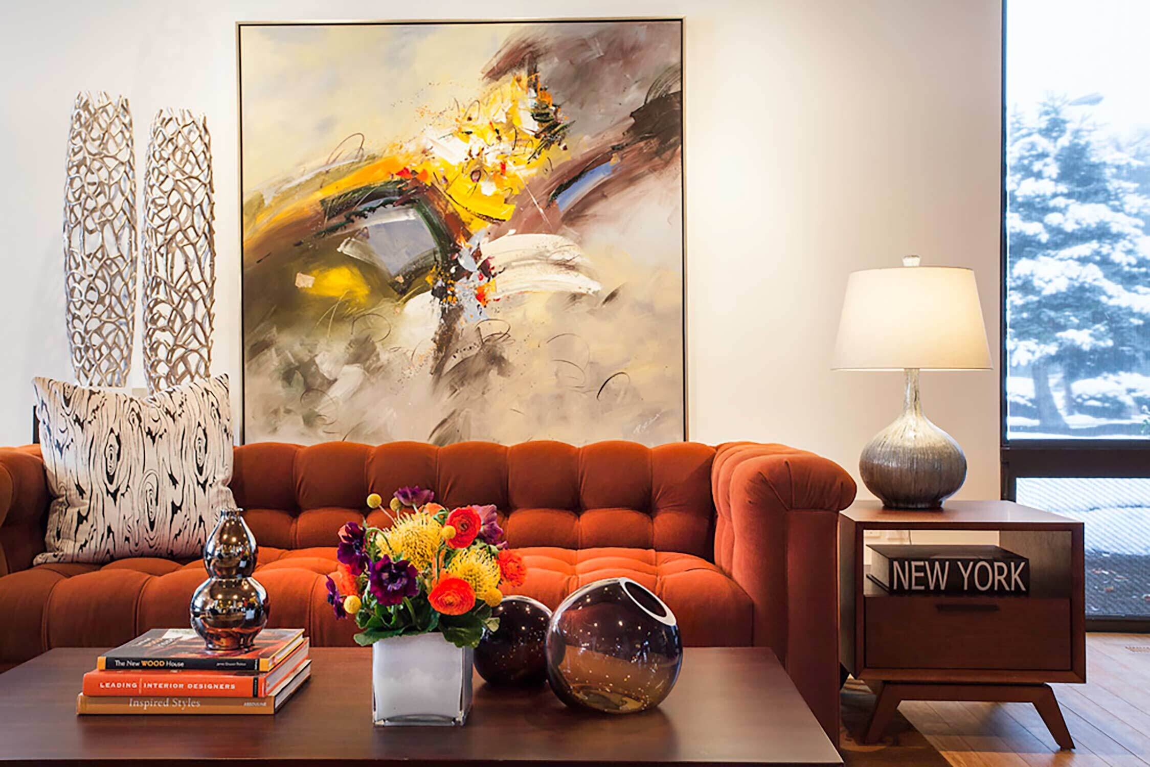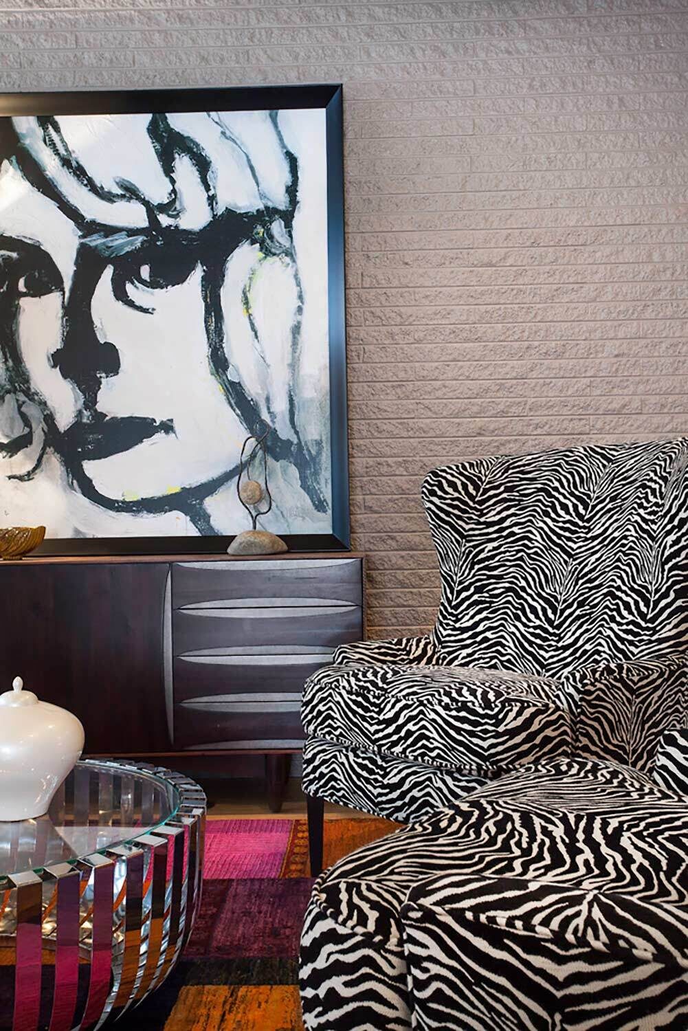 With its towering ceilings and spacious footprint, this mid-century stunner is a great example of playing with scale. We leaned into that roomy feel in the chef's kitchen and seemingly endless white walls dotted with bright accents. You can catch those pops of color in the art selection, the eye-catching fireplace, and furnishings.