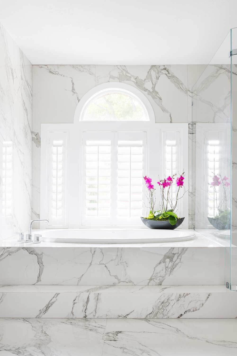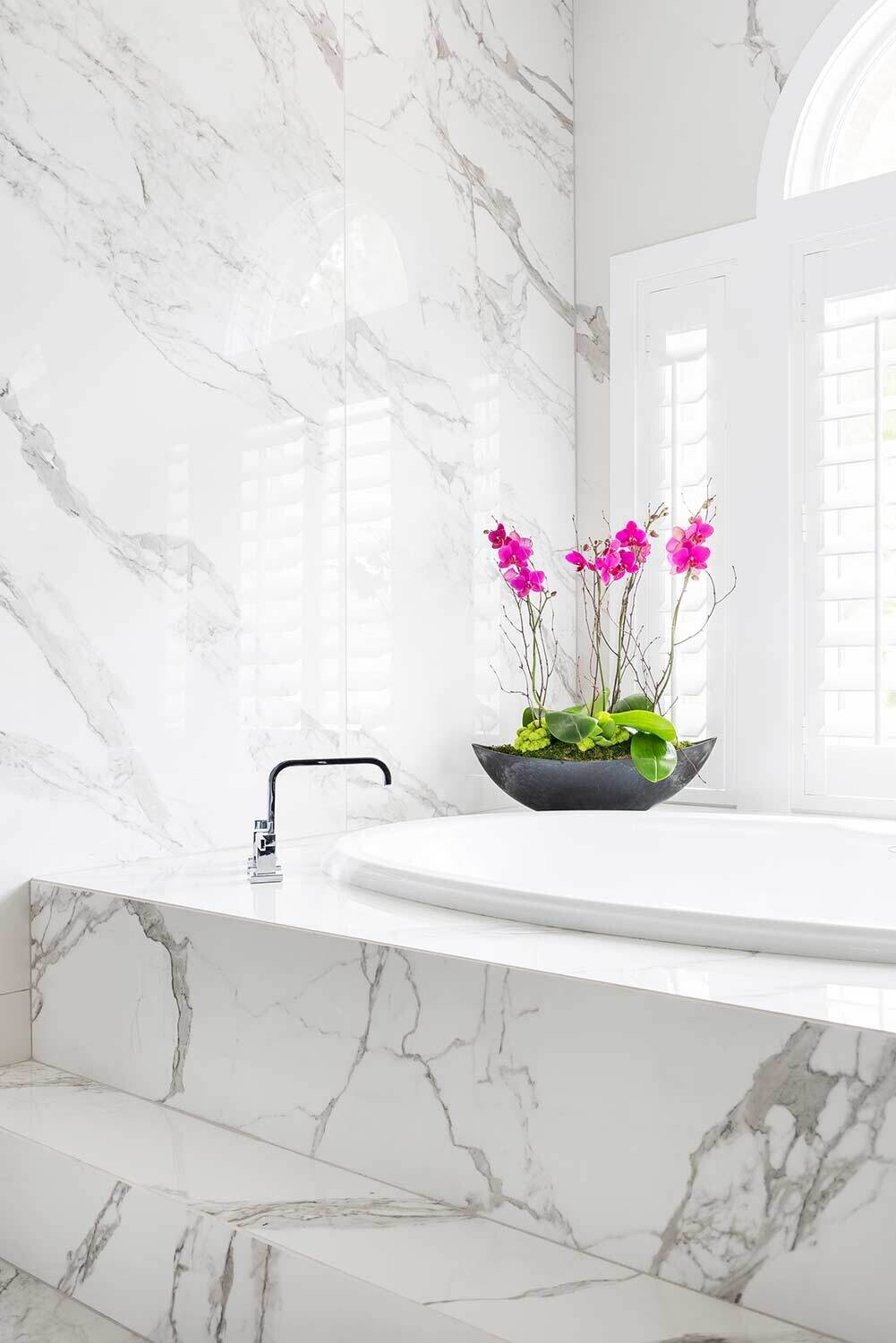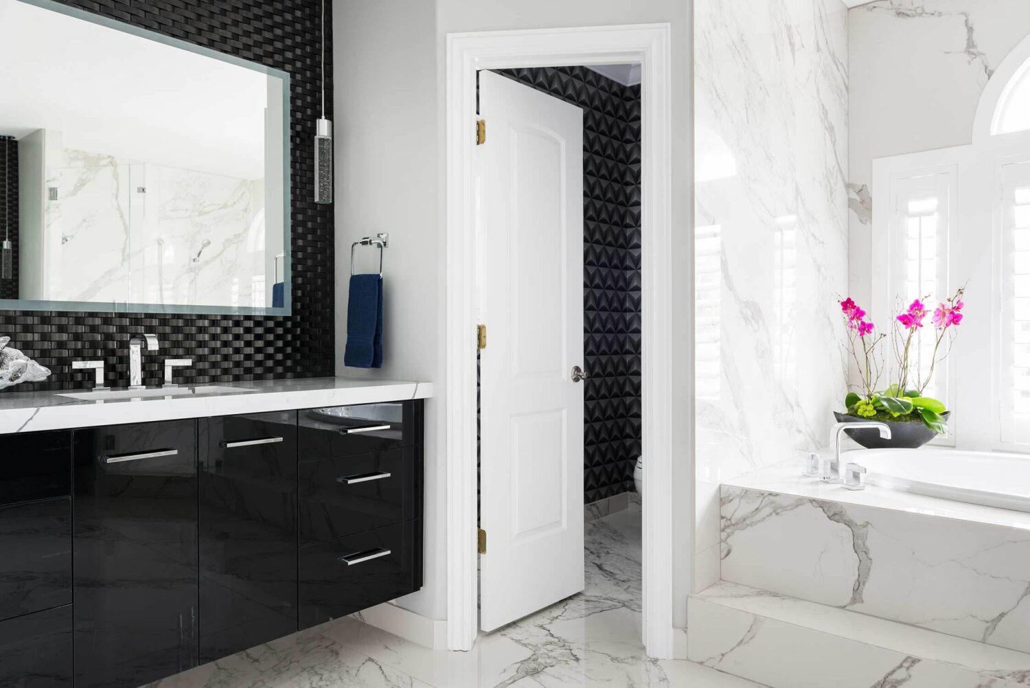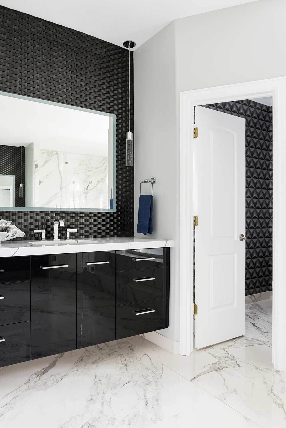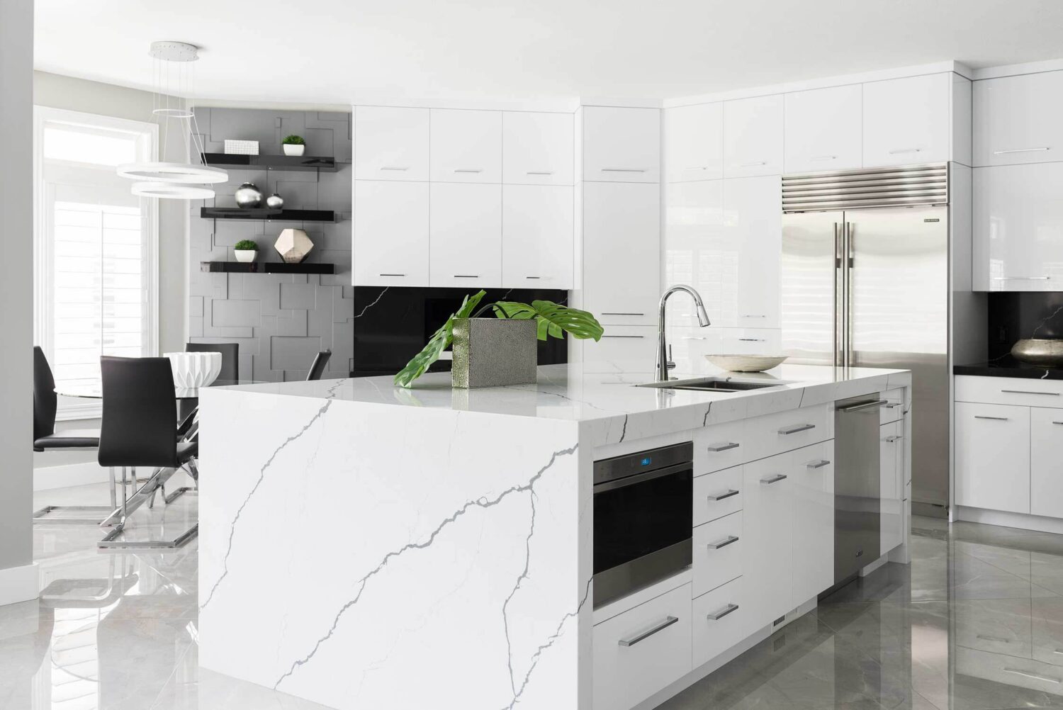Going from Tuscan styling to Ultra-Modern is no small feat! It requires a creative eye to reimagine the space and a clear vision to bring it all together. That's what our residential team was able to do on this Holladay, Utah stunner. The key to our transformation: opening up the floor plan by taking down several non-weight bearing walls and moving the color palette away from wooden floors and paneled walls to sleek, large-format porcelain tiles and white walls. It can be a tightrope, mixing the clients' wants with the original architecture of the home. Still, the transformation in the kitchen, with the waterfall feature on the island and textured wall detailing, truly highlights how a clear vision and focus can carry the day.