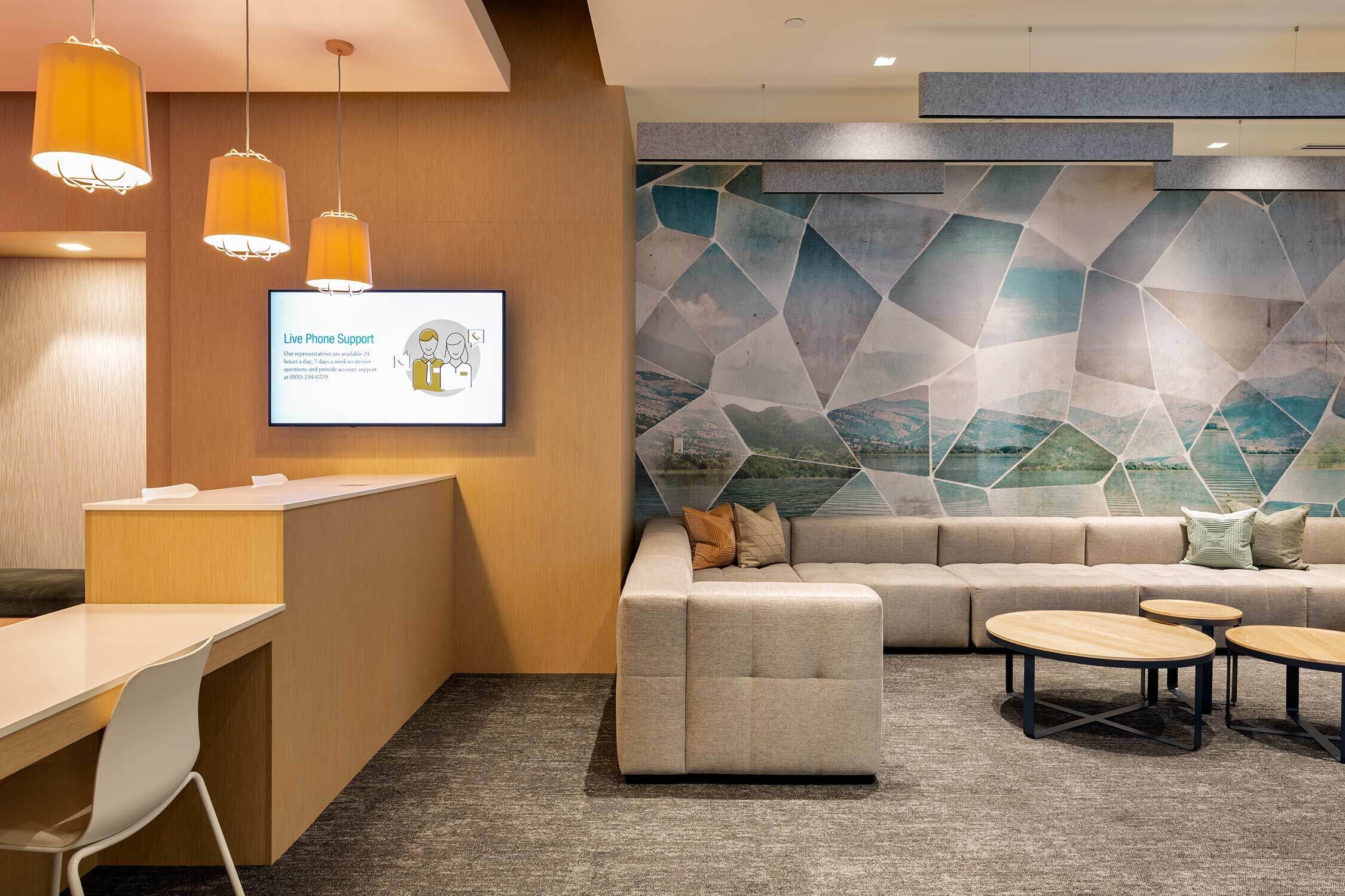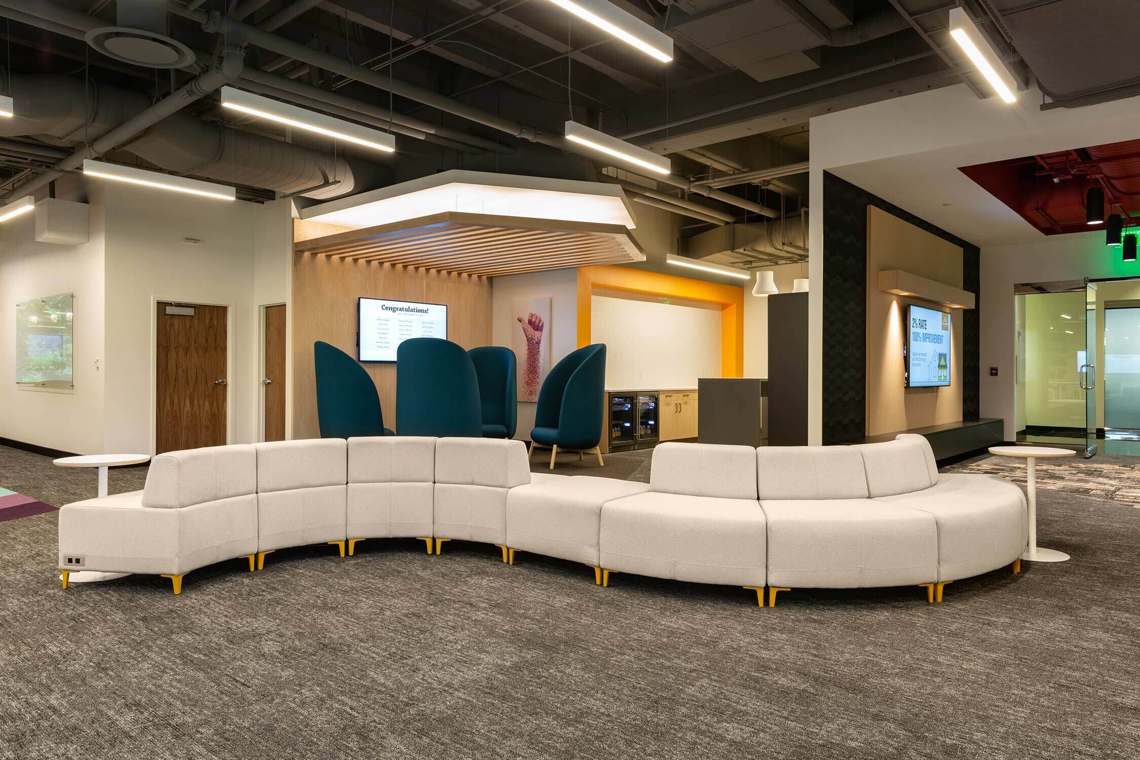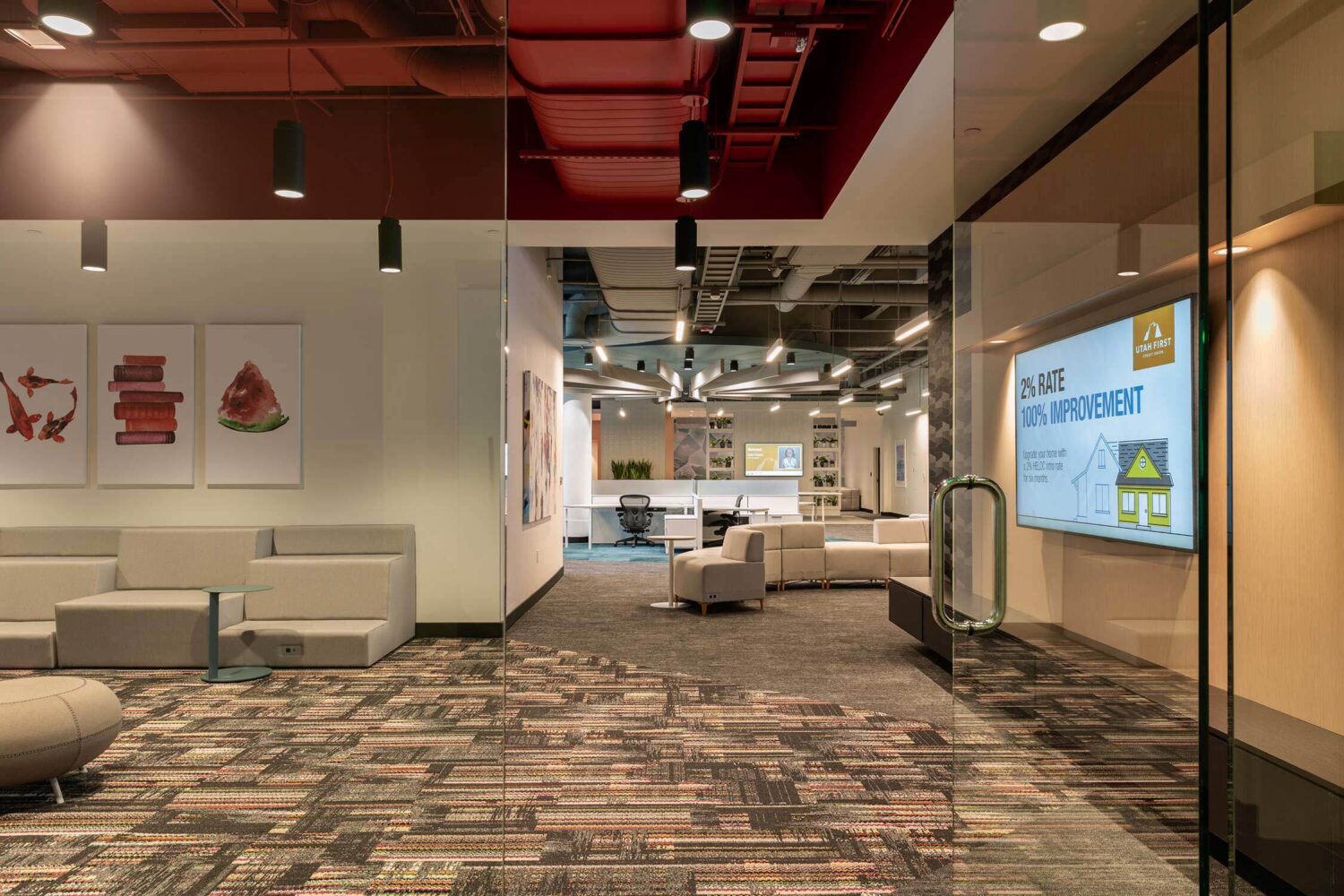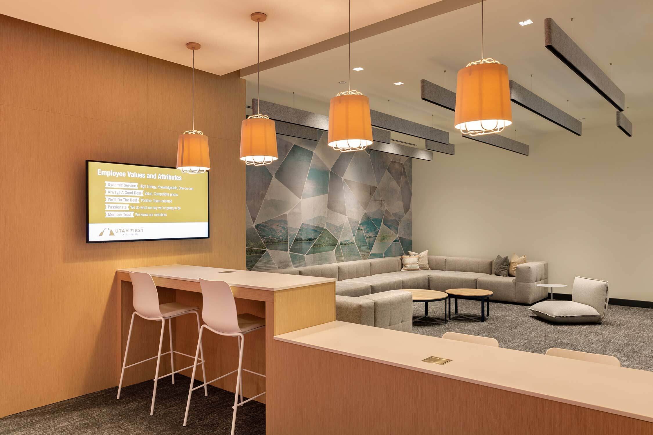 Utah First has a playful, non-judgemental approach that goes back to its 1935 post-depression era founding. So when the Credit Union wanted to update its corporate headquarters, it needed a design partner who could help toe the line between trusting banking organization and color outside of the lines lender. Our design pairs playful lighting, colors and accent seating with true function, emmersing employees in an environment that truly reflects the brand.