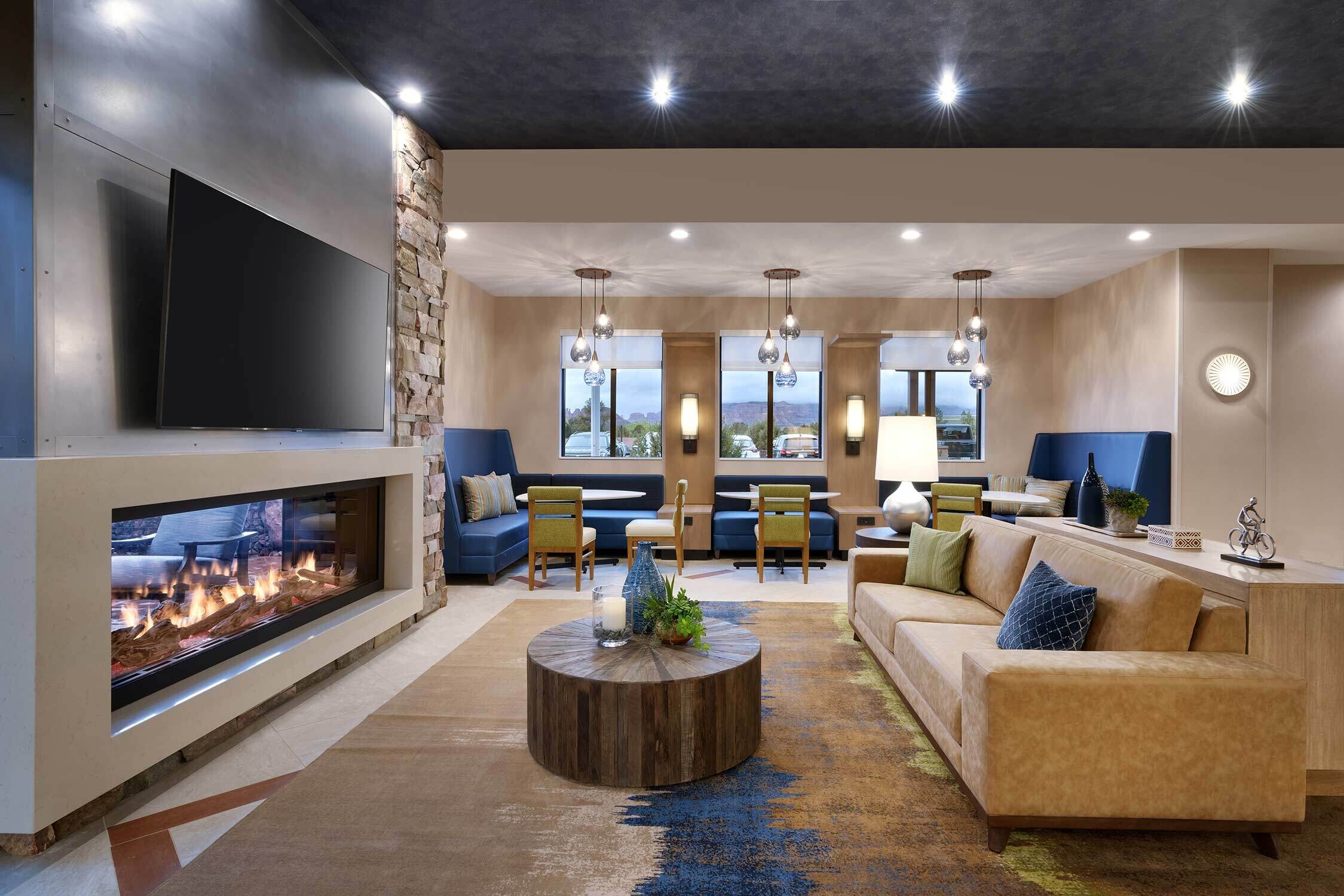 When Marriott Bonvoy was ready for a more modern take on its extended-stay, Residence Inn location in Sedona, Arizona, they turned to the Open Range team for stylish updates to its shared dining, outdoor seating, meeting and gym spaces. Using the brand’s characteristically blue palate as a starting point, we were able to create brand cohesion while also weaving in local elements to make the space feel more like home.