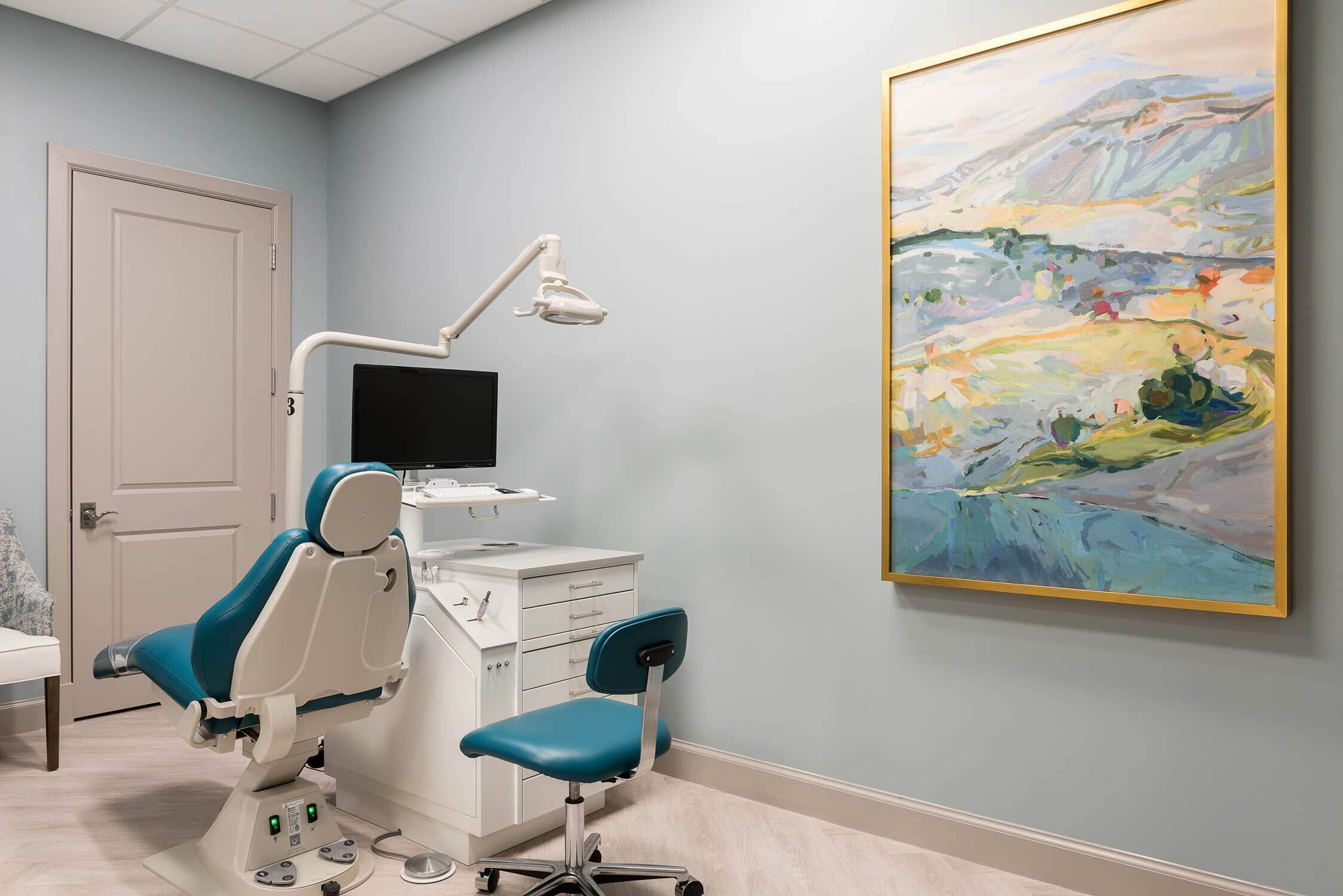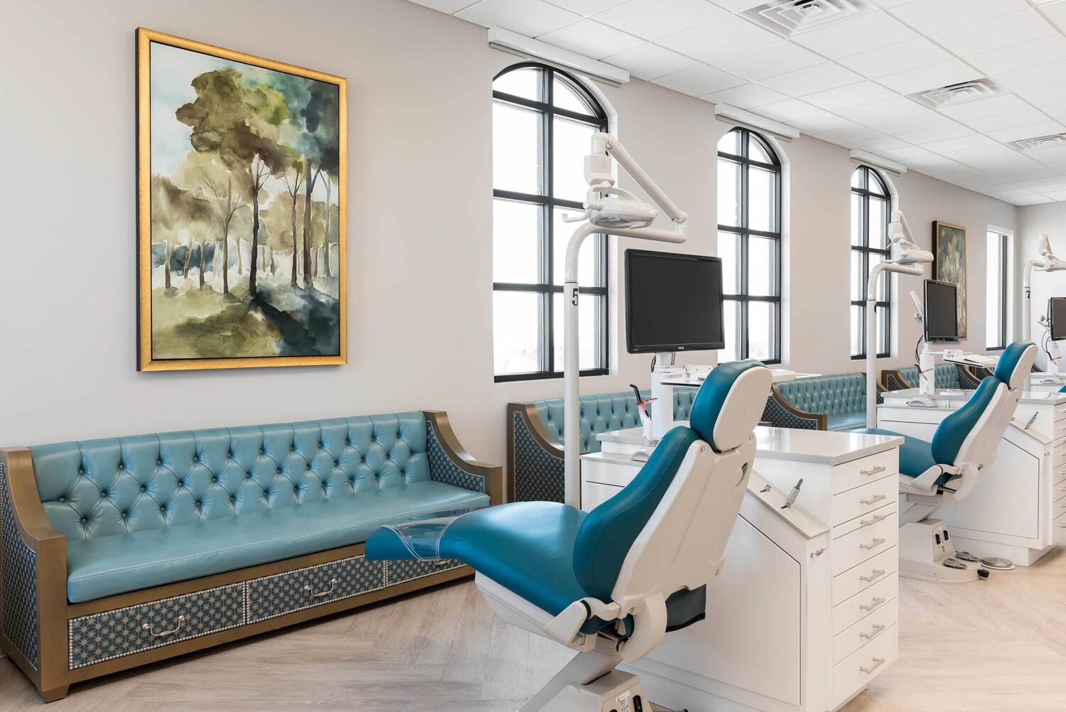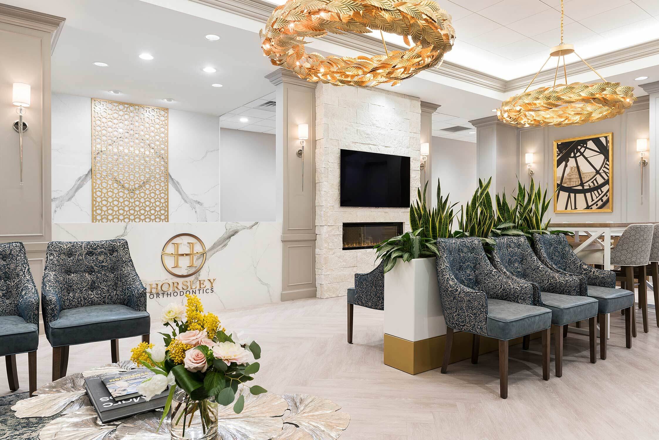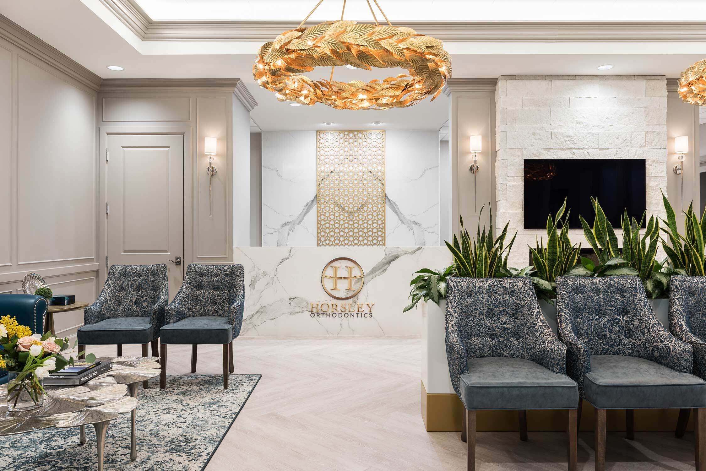 Very few people look forward to going to the orthodontist, so when the Horsley Orthodontics practice came to Open Range for guidance on their waiting and patient rooms, we knew the design would need to be clean, yet also infuse a sense of comfort and warmth that is often missing in healthcare settings. By pairing muted wall color palettes with splashes of gold and dark blue, we were able to move away from sterile and clinical to a fresh, warm and inviting healthcare space.