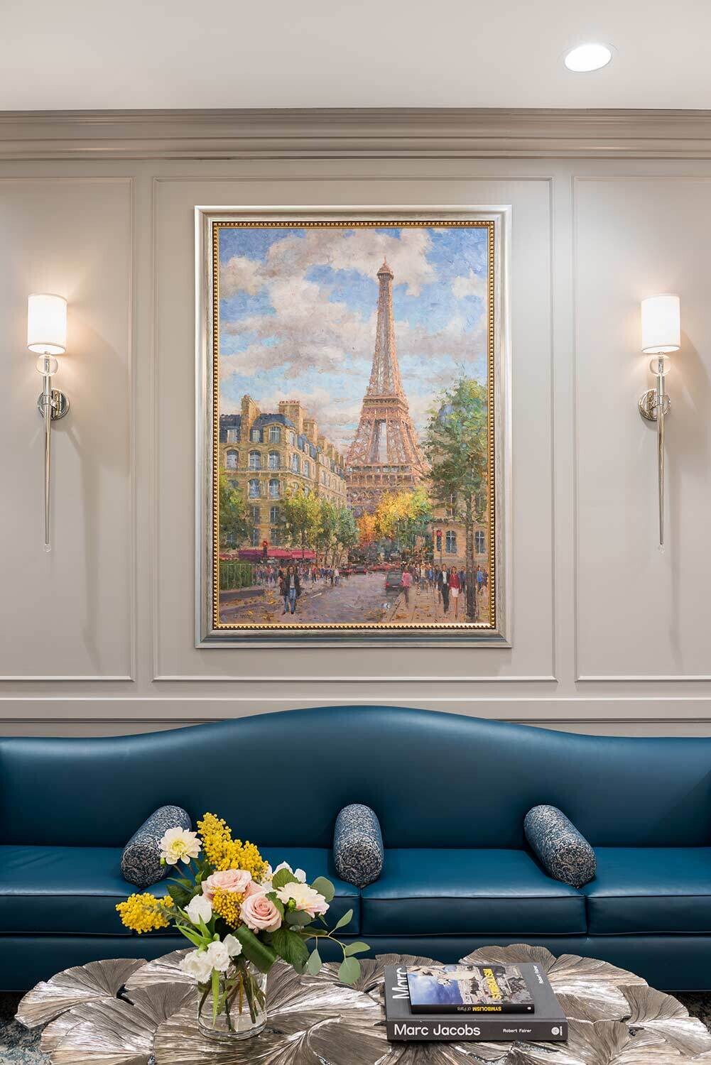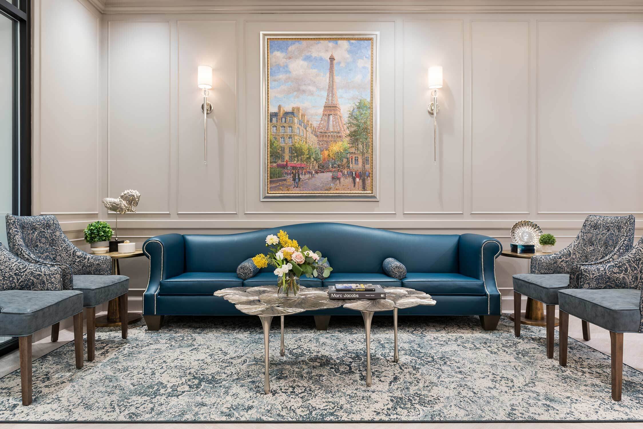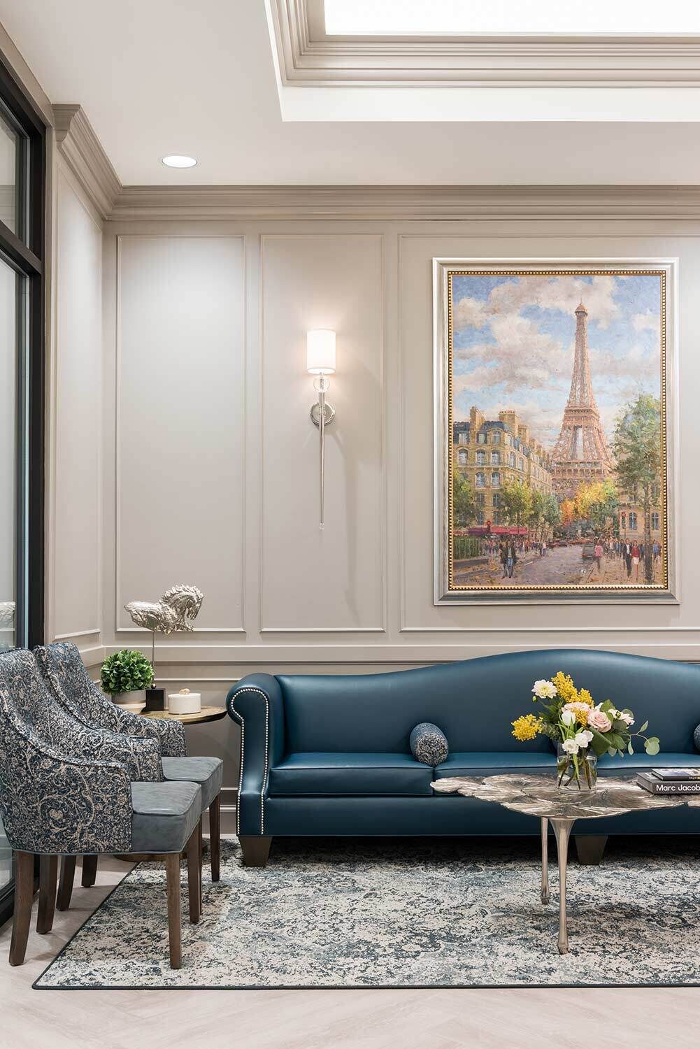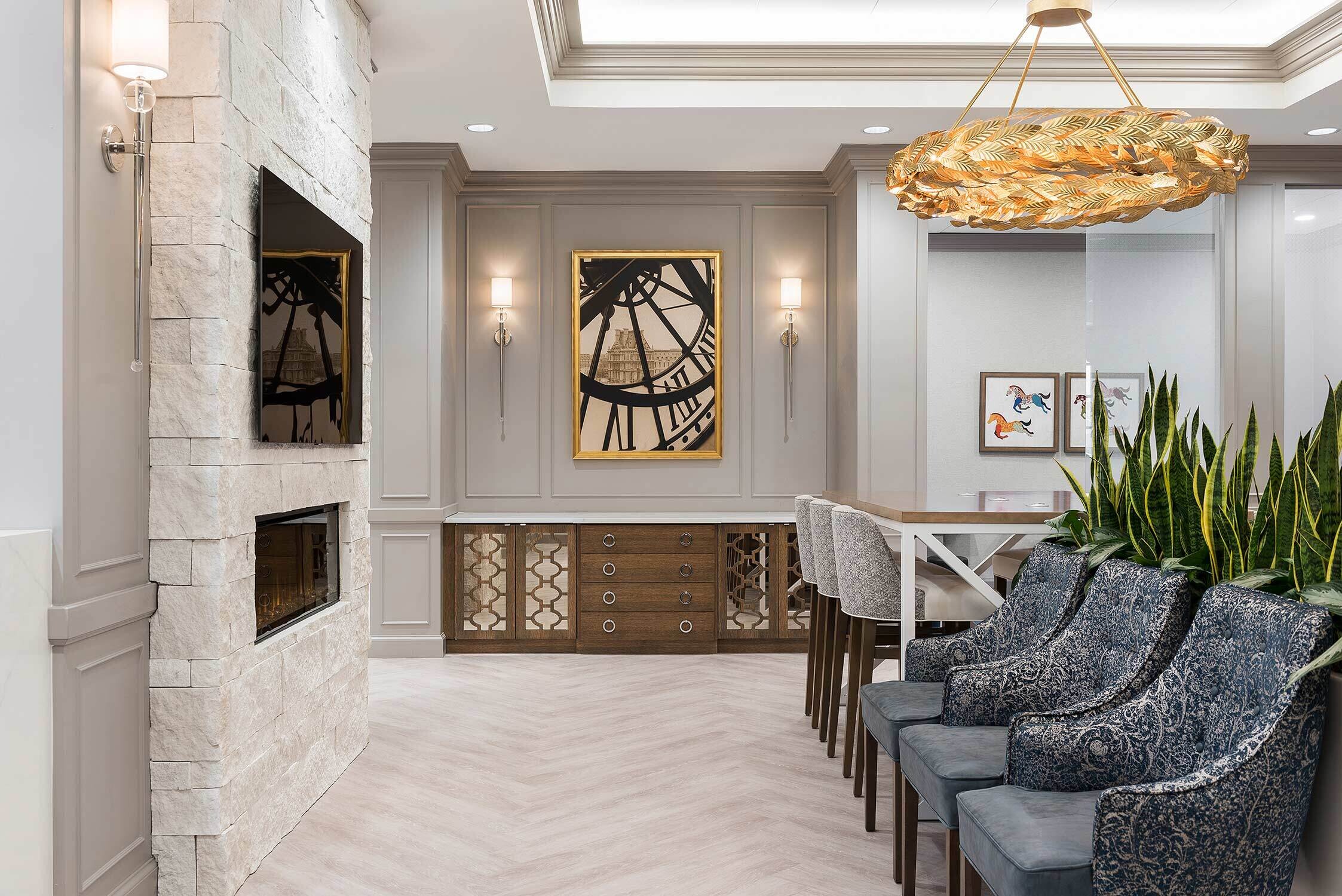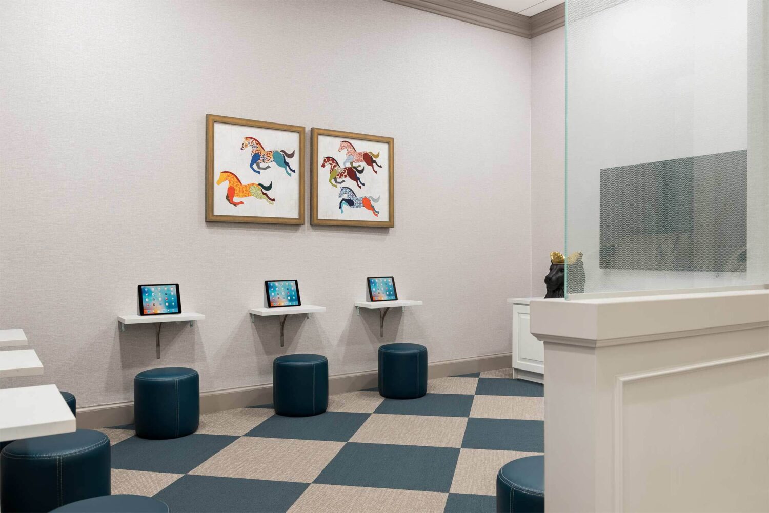 Very few people look forward to going to the orthodontist, so when the Horsley Orthodontics practice came to Open Range for guidance on their waiting and patient rooms, we knew the design would need to be clean, yet also infuse a sense of comfort and warmth that is often missing in healthcare settings. By pairing muted wall color palettes with splashes of gold and dark blue, we were able to move away from sterile and clinical to a fresh, warm and inviting healthcare space.